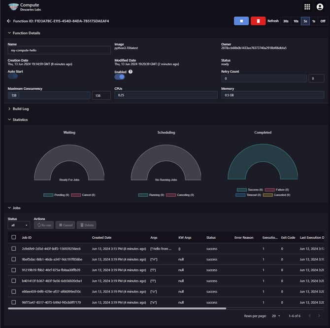 Each time we invoke, or pass new arguments to, a Function, that triggers a single Job, which we can track in real time using the Compute UI. Each user can run up to 1000 concurrent Jobs.