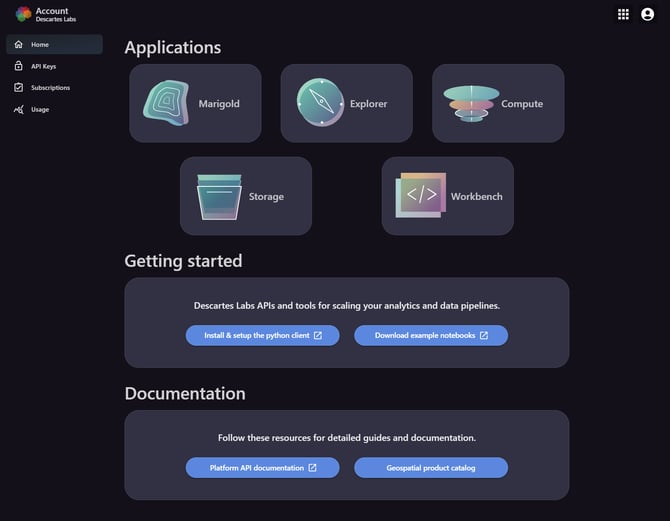 By now you should have been able to create an account, verify your email, and log in to your account. If you do not have a Descartes Labs account, please reference the article Getting Access to the Platform.