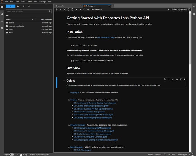 Workbench is a hosted development environment specially tuned to work with the Descartes Labs Platform APIs. Learn more about managing your Workbench in the Workbench Setup KB Article.